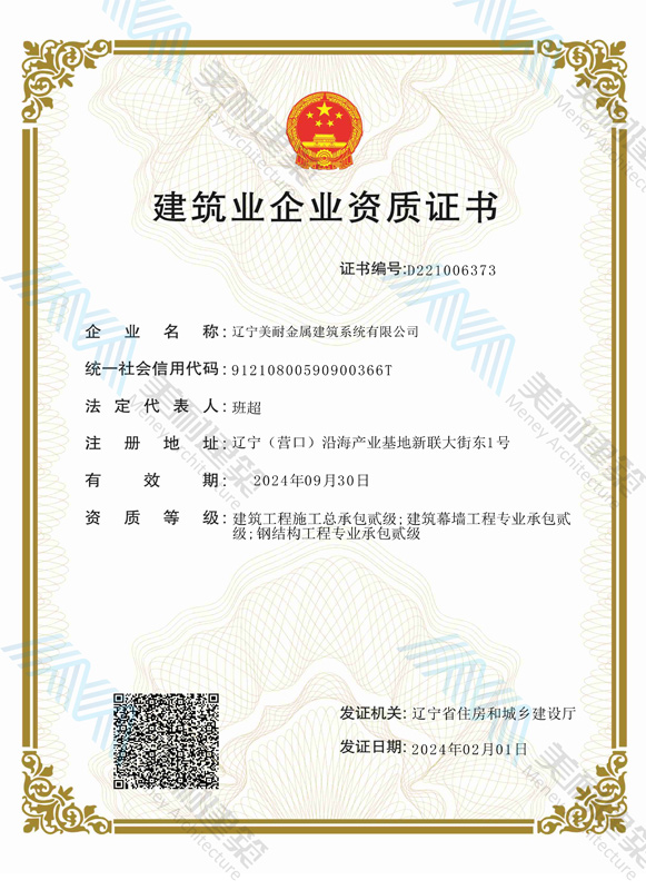 遼寧美耐金屬建筑系統有限公司位于遼寧(營口)沿海產業基地,專注于預制金屬建筑系統領域,是一家集工業建筑設計、制作、施工及相關的技術咨詢與服務為一體的綜合性服務企業。作為國家鋼結構協會會員、中國建筑金屬結構協會會員單位與國家高新技術企業,美耐建筑集建筑工程施工總承包、鋼結構工程專業承包等多種資質于一身,并擁有22項鋼結構建筑領域專利,9項軟件著作權。
